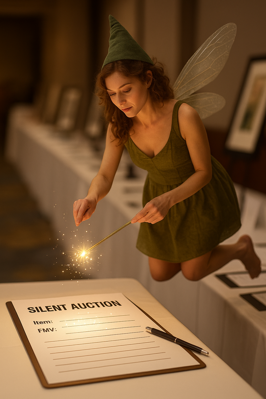 Humorous image of a fairy waving her wand over silent auction bid sheets under the text “FMVs Don’t Magically Appear,” highlighting the myth that Fair Market Values automatically show up in charity auctions.
